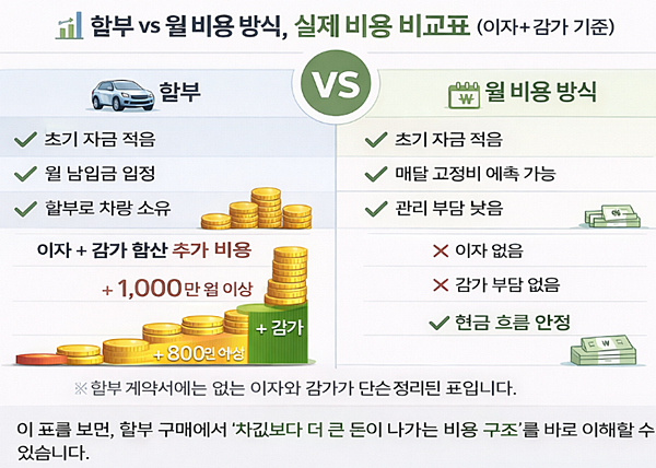 하지만 할부 구매에서 진짜 비용은 차값이 아니라 이자와 감가에서 발생합니다.